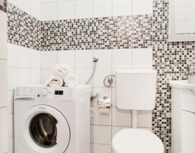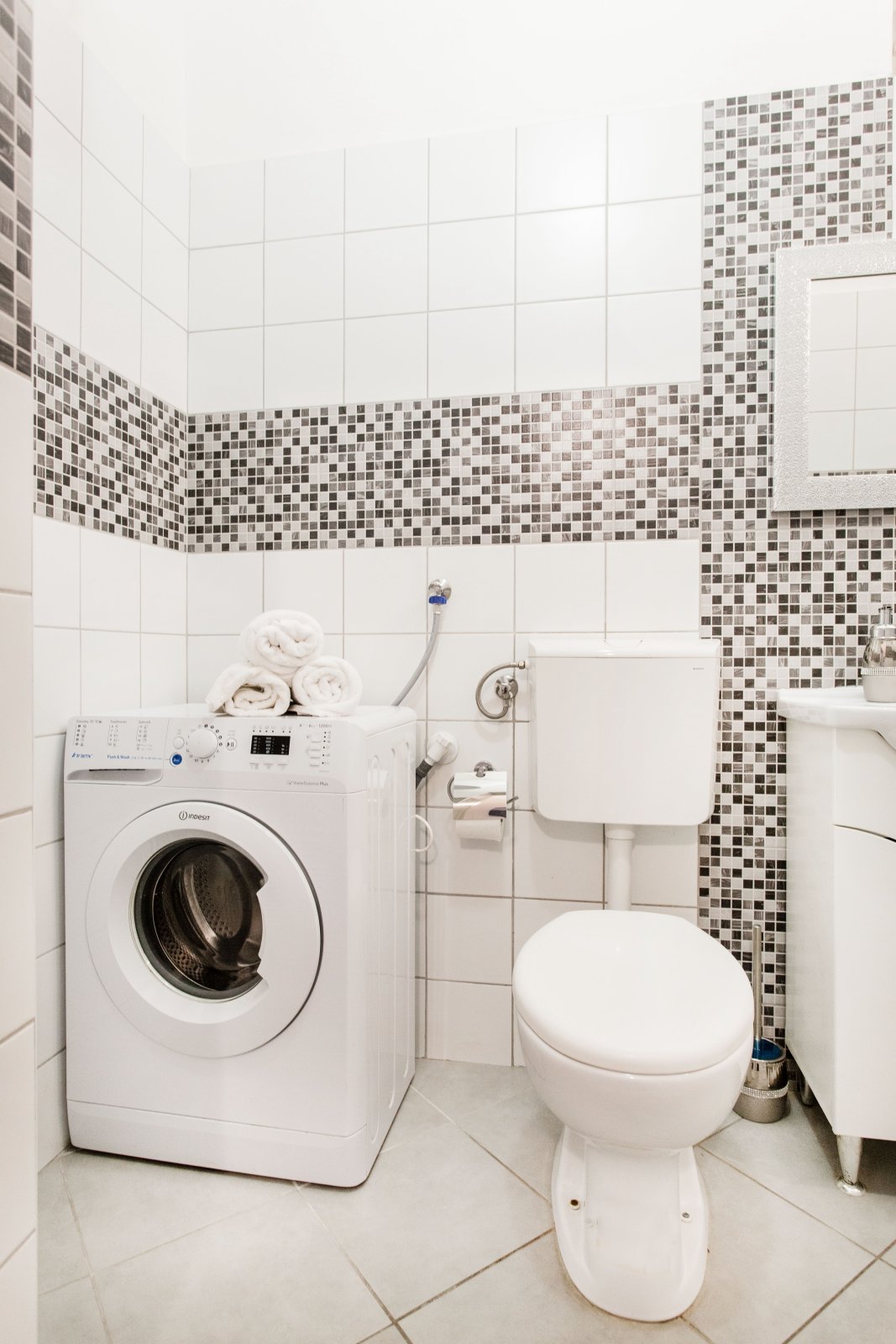 Bathroom: hair dryer, washing machine, mirror, bath tub, mop